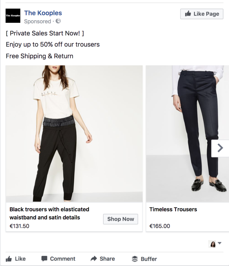 Không chỉ dùng cho thiết bị để bàn, loại quảng cáo này cho phép bạn xoay vòng nhiều hình ảnh trong một quảng cáo, cung cấp cho các thương hiệu một format có tính tương tác và linh hoạt hơn để thu hút khách hàng. Hình ảnh minh họa bên dưới lấy từ nhãn quần áo The Kooples cho thấy kiểu quảng cáo này trông như thế nào trên màn hình thiết bị để bàn: